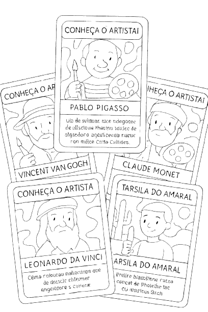 Cartões ilustrados com informações rápidas e curiosas sobre os grandes nomes da arte. Ideal para usar como jogo, consulta ou exposição em casa ou na sala de aula.
